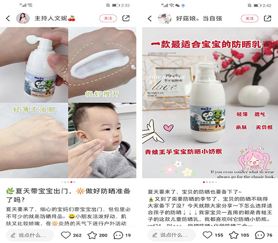 青蛙王子创立于1994年,是儿童个人护理产品的领先国内品牌之一。本次合作是为推广青蛙王子防晒霜产品,采用135位小红书腰部、底部母婴博主,就夏日宝宝防晒护肤方向原创图文笔记,植入青蛙王子“防晒小奶瓶”产品,从而对宝妈人群进行精准种草,并引流到青蛙王子天猫店铺。